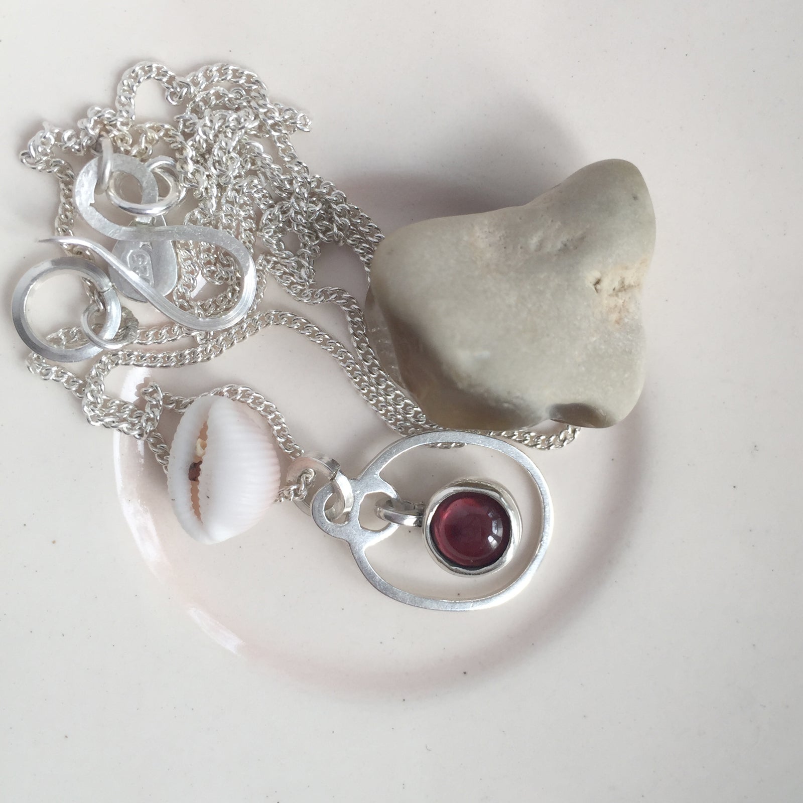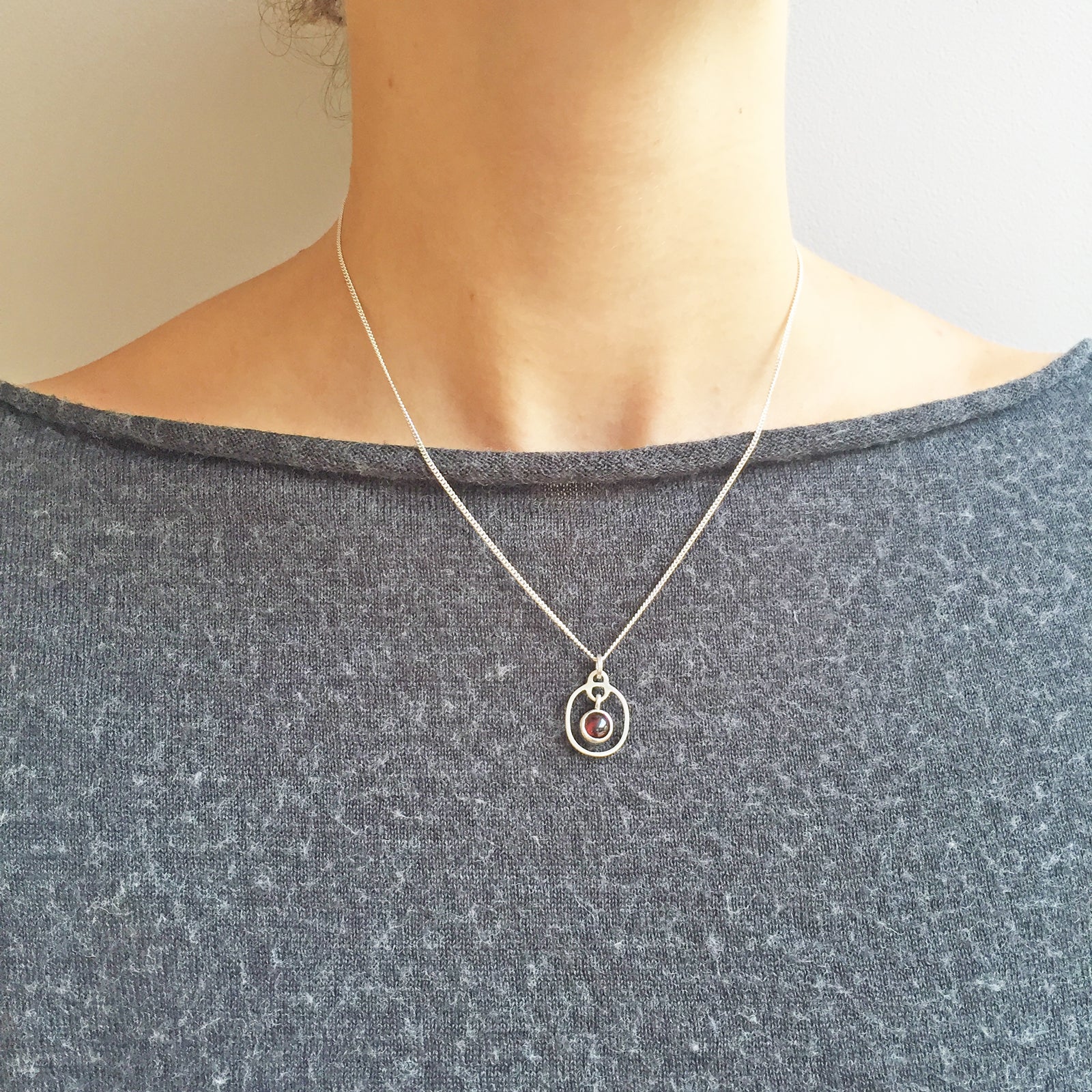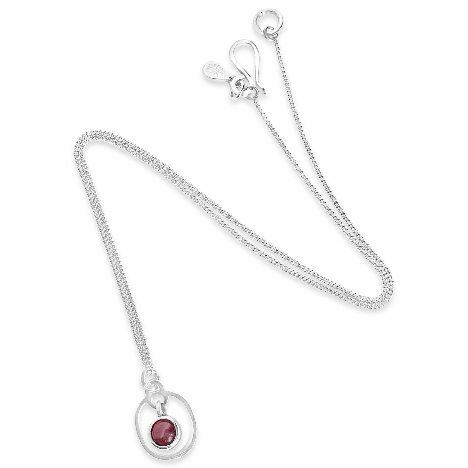 Art Deco inspired oval birthstone pendant, makes a perfect birthday gift. Featuring January's birthstone the beautiful deep red Garnet. The stone is set in a sphere cabochon setting which hangs inside the oval disc. The back is open with star to let the light through. Made in sterling silver and hangs on a 18 inch curb chain. Necklace oval drop 30mm long and 13mm wide. Stone width 6mm. Comes in Vicky Davies Box with printed stone meaning.