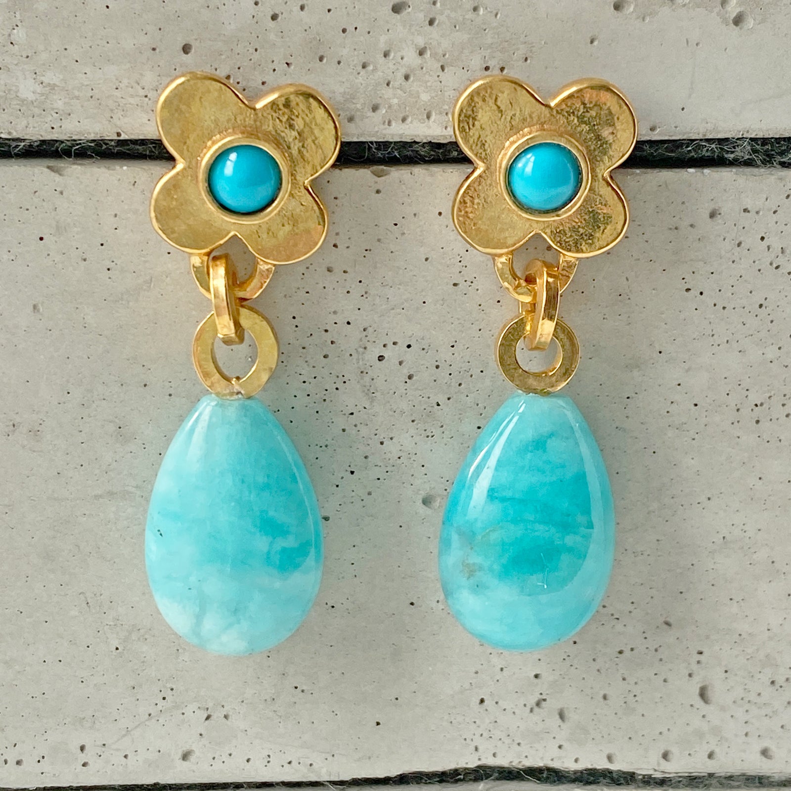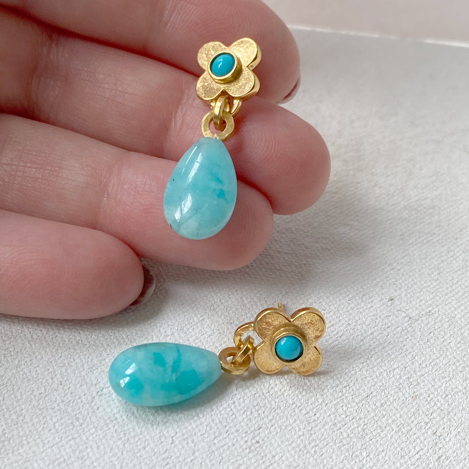 These beautiful stunning pear shape Amazonite half drilled beads hang from cute silver clover studs set with Persian Turquoise cabochon stones. Handmade by Vicky in her East London studio. The clover is made in solid silver and has a molten organic texture and 18ct gold plated.