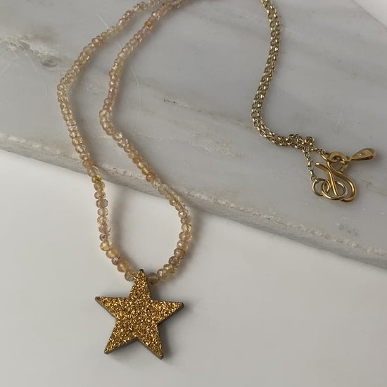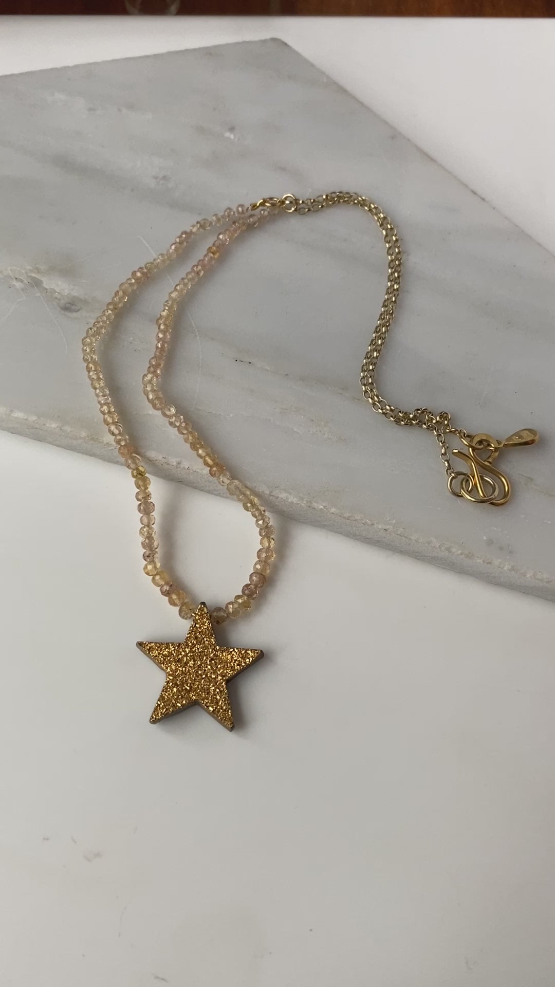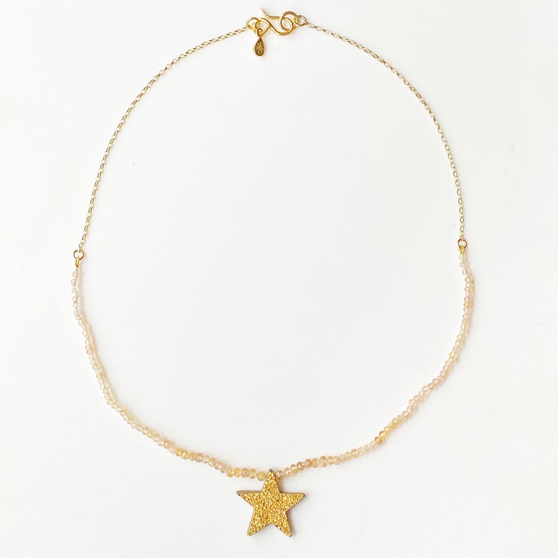 The Druzy star was sourced from America many years ago and has been hand cut and coated in gold. Stone measures 23mm at the largest point. The topaz beads are slightly graded and measure between 2mm -3.5mm. Chain length 18 inches 46cm.