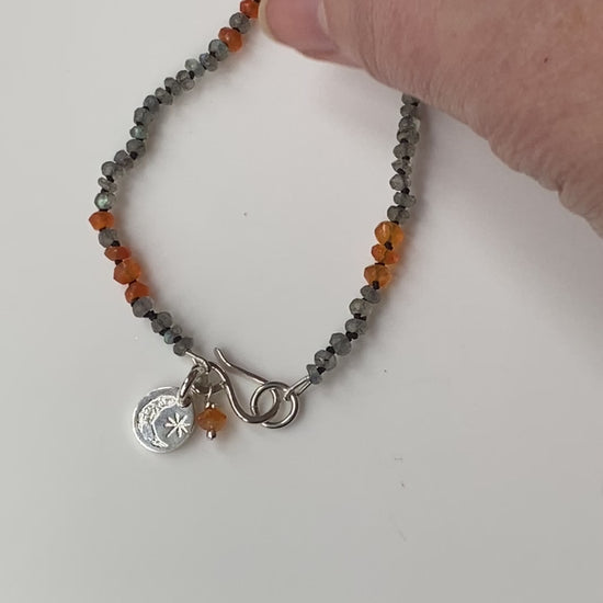 This beautiful Labadorite & Carnelian Friendship Bracelet features a solid silver Moon & Star hallmarked tag. Hand knotted on strong nylon black thread for added strength and attached with a solid silver handmade clasp. These Labradorite stones are clear grey with flashes of irredecent blue Labradorite is a very special magical stone and is associated with the element of Air and the mind. Also very protective and healing. Strug together with these bright orange Carnelian beads said to aid Courage Confidence and Motivation.