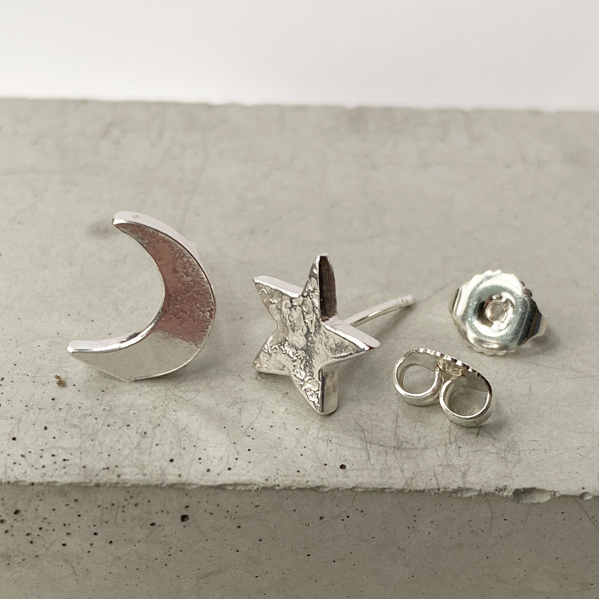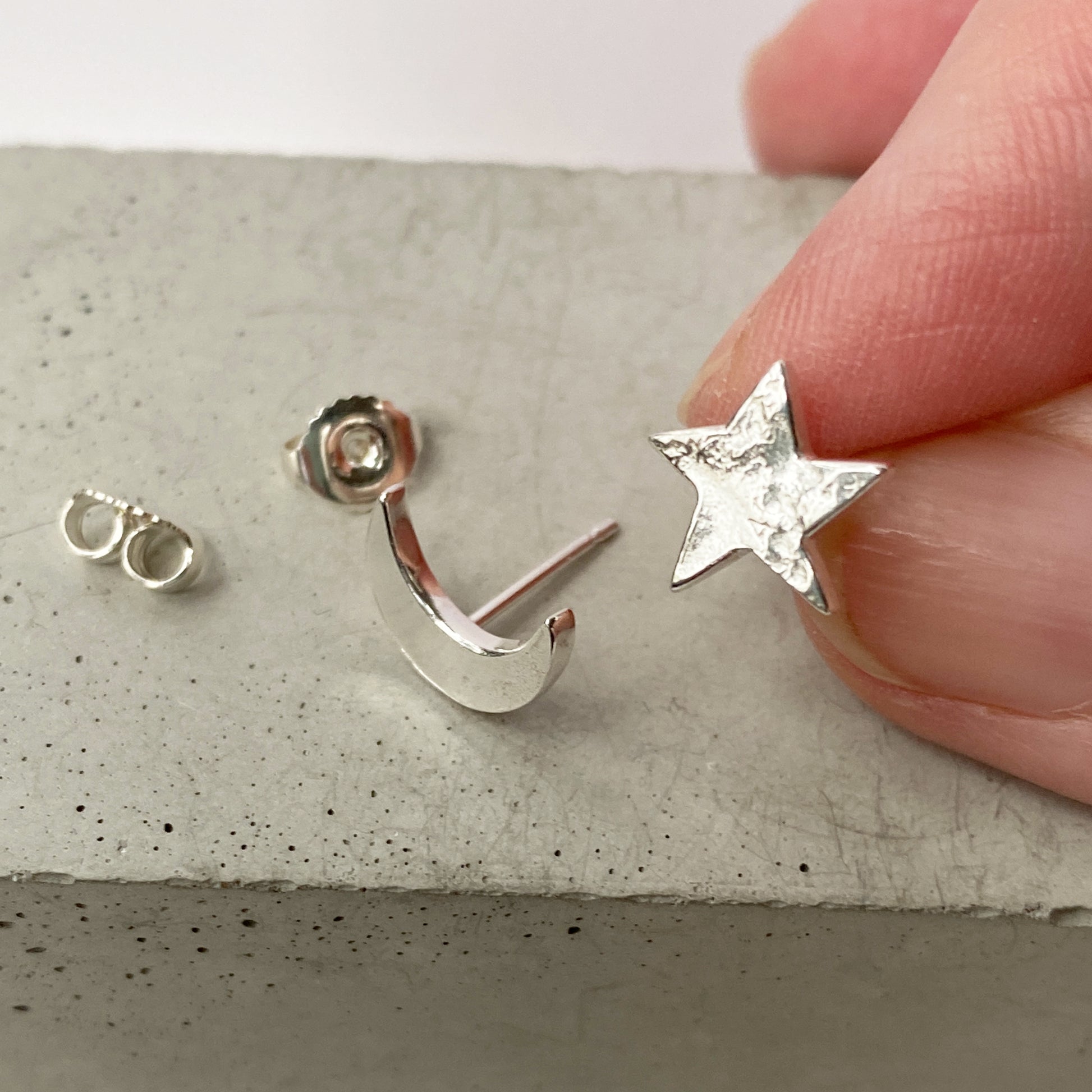 Five pointed star's and crescent moon inspired by the cosmos. These earrings are handmade by Vicky in solid silver and feature a lunar molten finish. Earrings are attached with silver studs with comfortable ear nuts and sit very comfortable on the ear