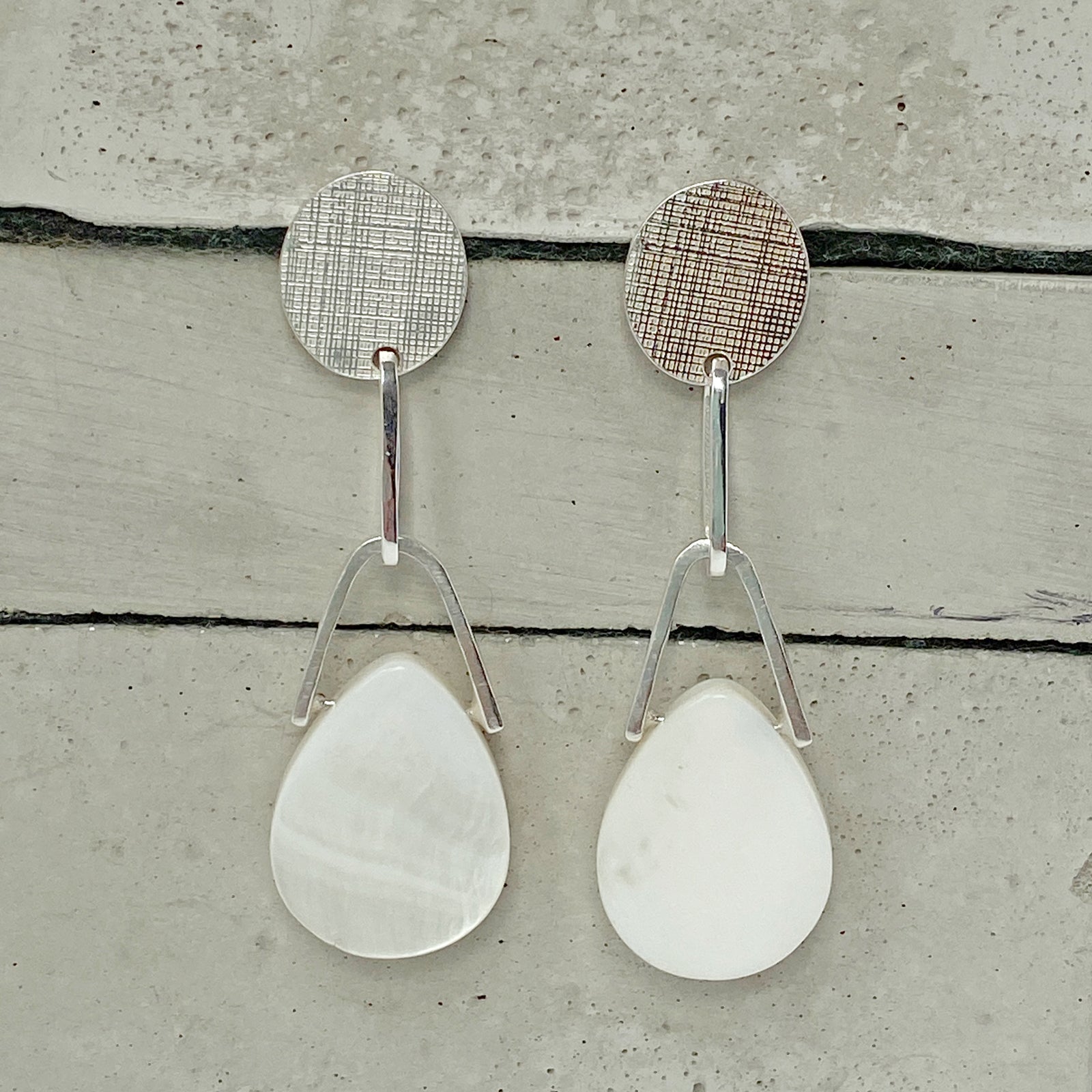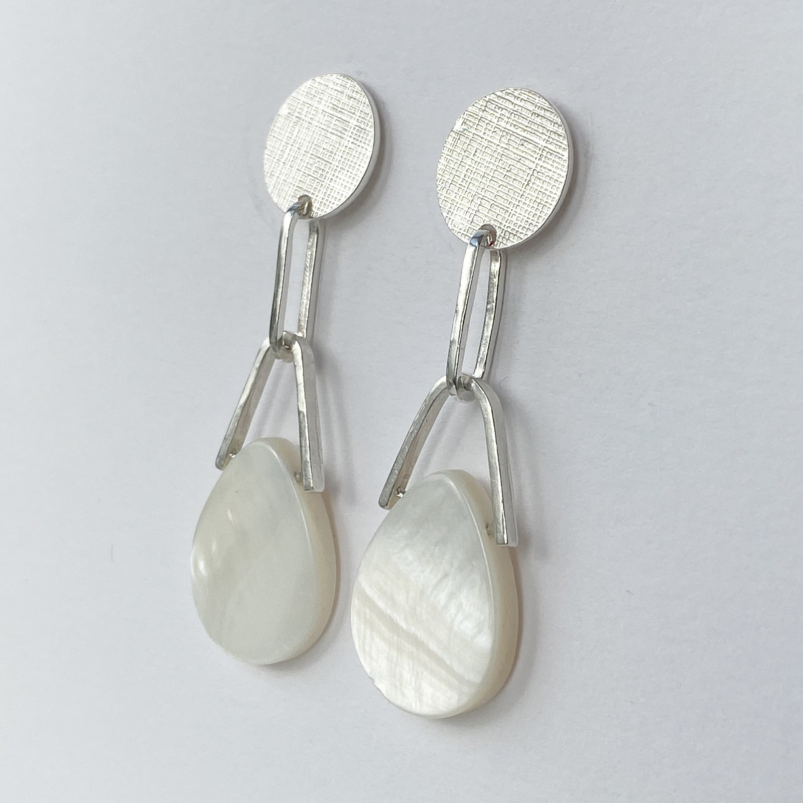 Handmade in solid silver these statement earrings feature shimmering pear shape Mother of Pearl beads which hang from textured silver post with chain links. Elegant and modern perfect summer earrings worn with pearl necklace or silver chain. Earring from top to bottom measures 5cm drop.
