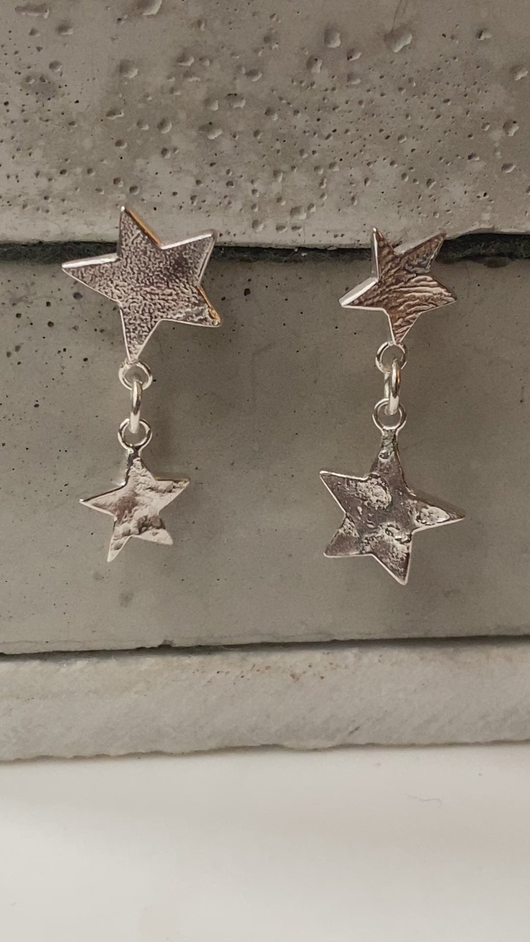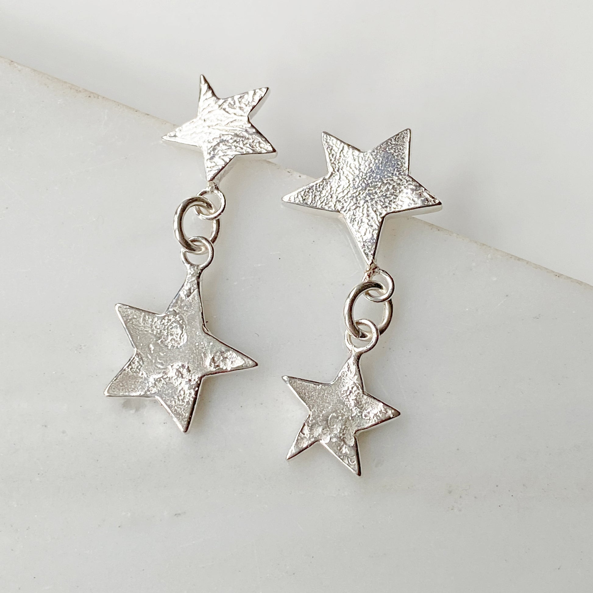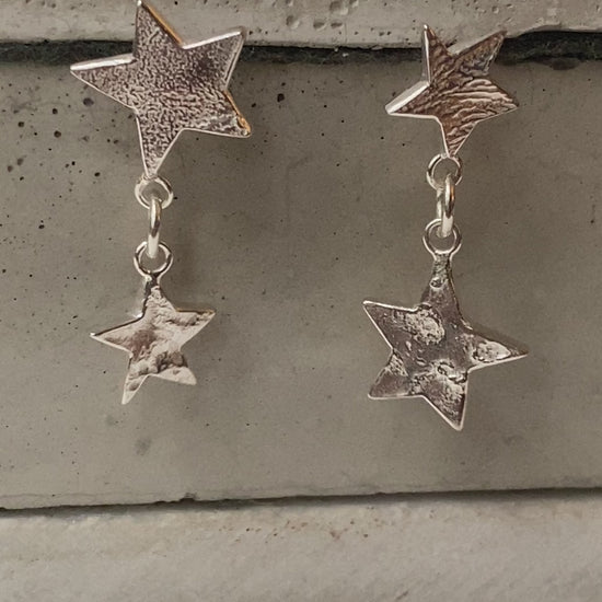 Five pointed star inspired by the cosmos. Molton Silver texured stars in two sizes mismatch drop earrings handmade by Vicky in solid silver. Earrings are attached with silver studs with comfortable ear nuts and very comfortable to wear.