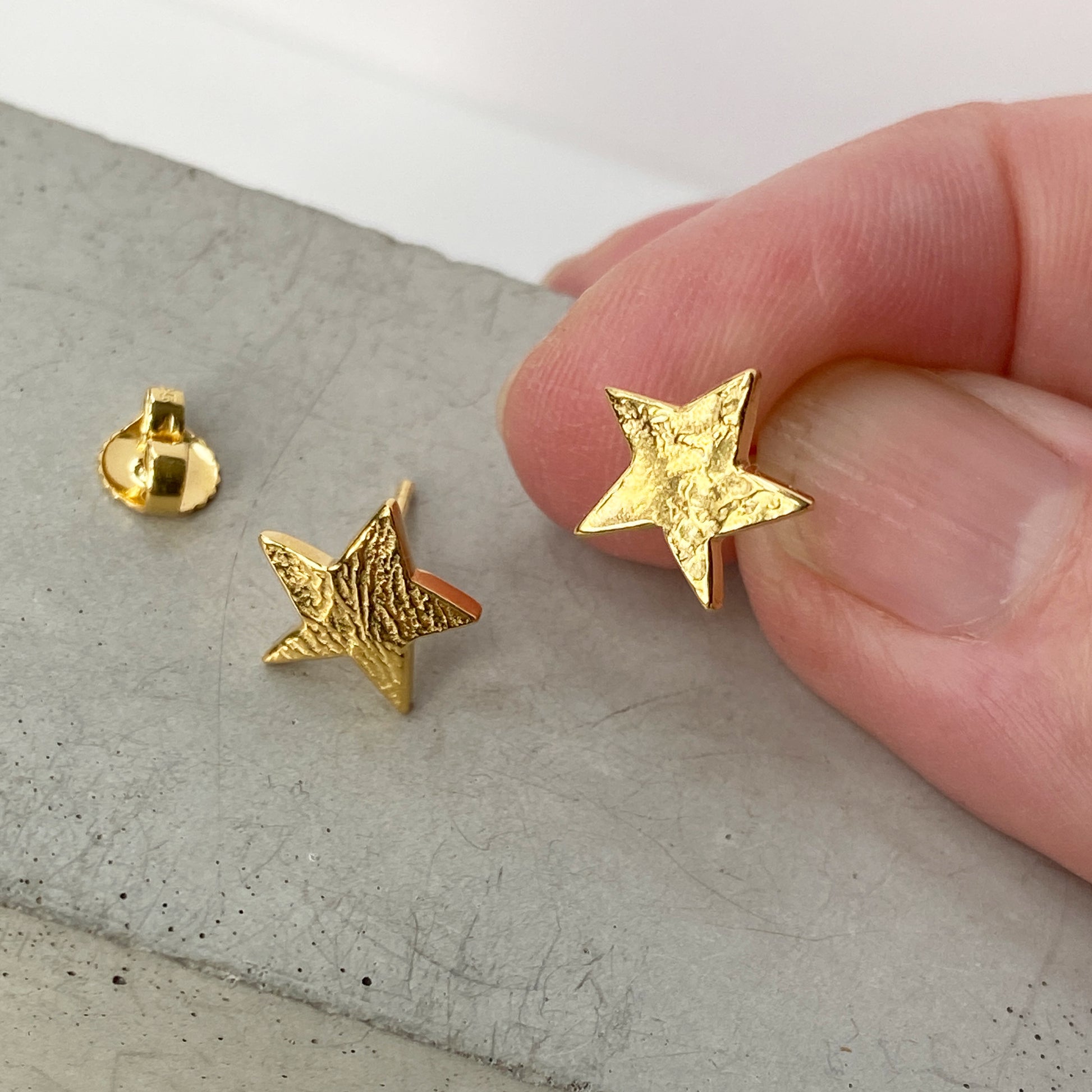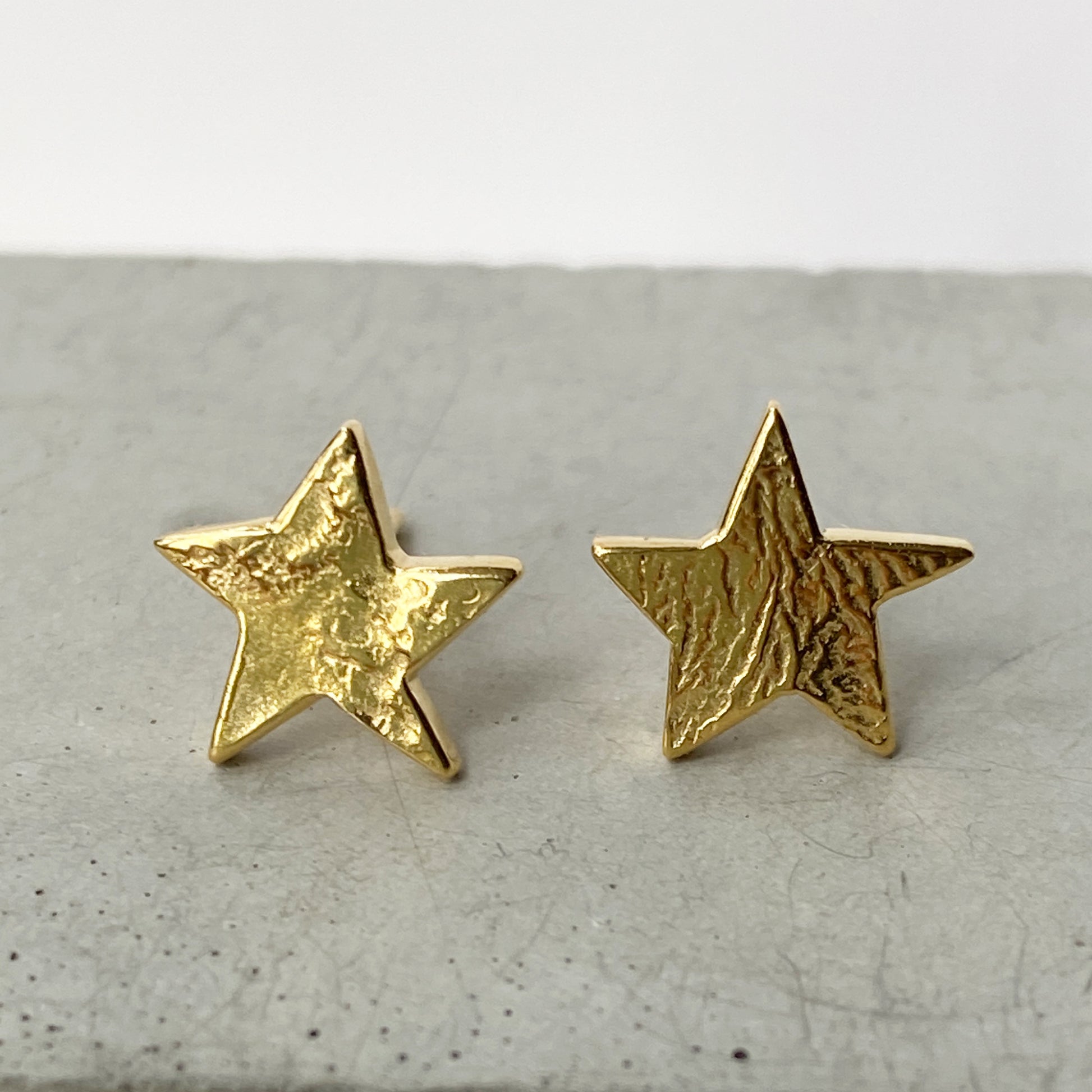 Five pointed star's inspired by the cosmos. Molton Gold texured stud earrings handmade by Vicky in solid silver and 18ct gold plated and feature a lunar molten finish. Earrings are attached with silver studs with comfortable ear nuts and very comfortable to wear.